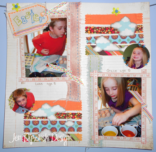 So I thought I would take a little break from designing and finish a page that I have been working on for some time. I’ve never been very good about doing my pages in order (chronologically or any other way) so right now my focus is Easter… last Easter… as in 2011. I know, a little late, but it’s how I roll. I’ve starting working with fabric (my new love!!) on my pages and really like how it’s been coming out.