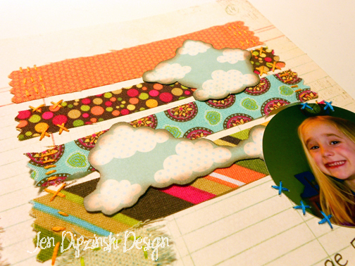 Paper: Basic Grey; Paper for Frames: Basic Grey; Fabric: Hobby Lobby; Fringe & Canvas Tag: Canvas Corp.; Embroidery Floss: Iris; Ribbon: American Crafts; Clouds: My Mind’s Eye Paper with distressed ink; Ink: Ranger